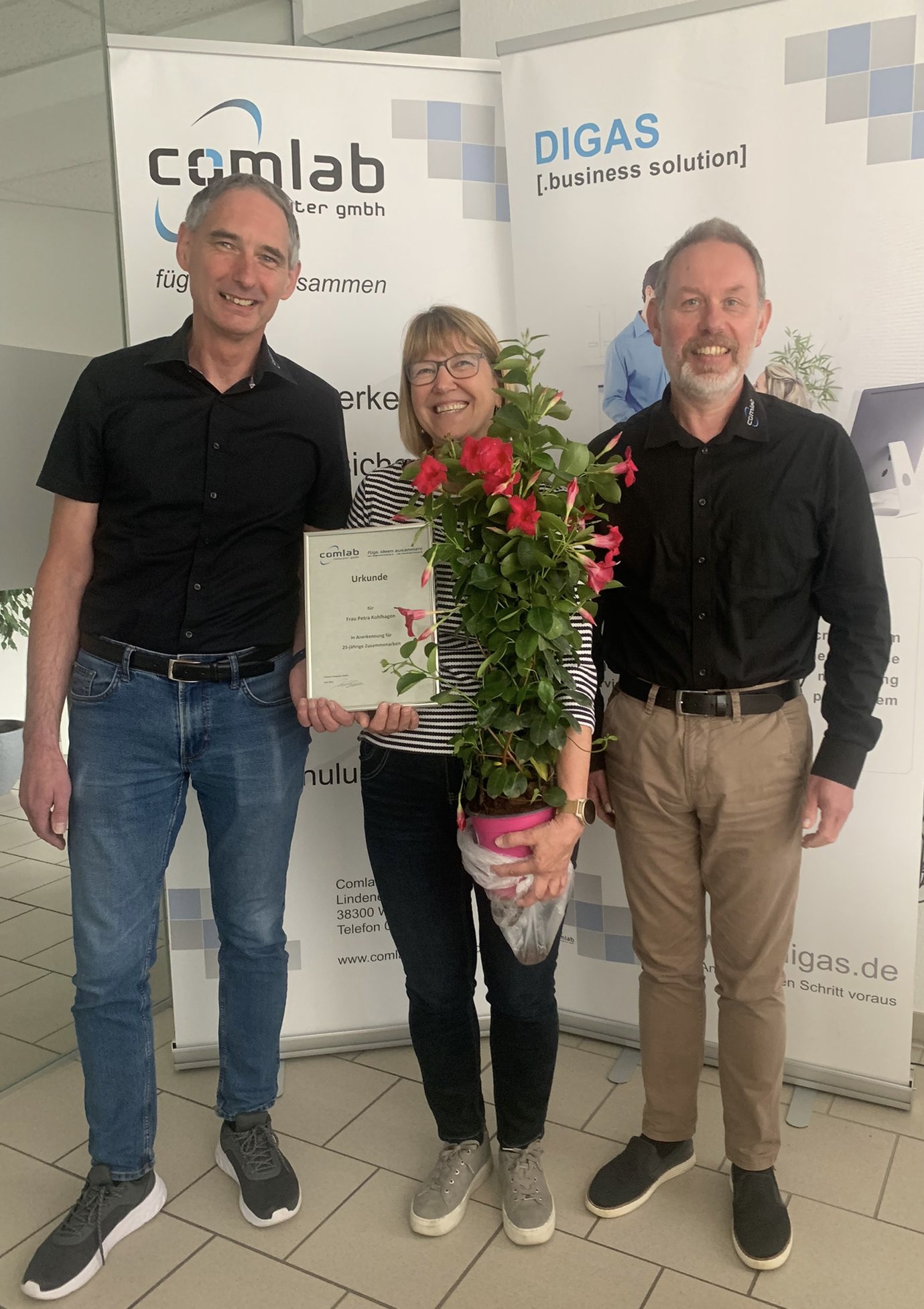 Liebe Petra, seit 25 Jahren kümmerst du dich zuverlässig um die Buchhaltung und Buchführung. Aber nicht nur das, im Hintergrund machst du vieles mehr. Dank dir geht keinem das Büromaterial aus, die Büropflanzen überleben und es ist immer frischer Kaffee da. Du bist immer hilfsbereit, hast für alle ein offenes Ohr und versorgst ganz nebenbei das ganze Team regelmäßig mit selbstgebackenem Kuchen.